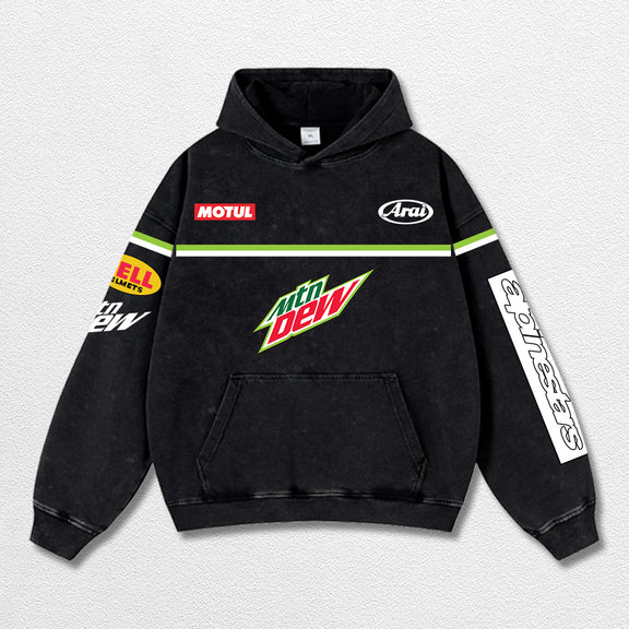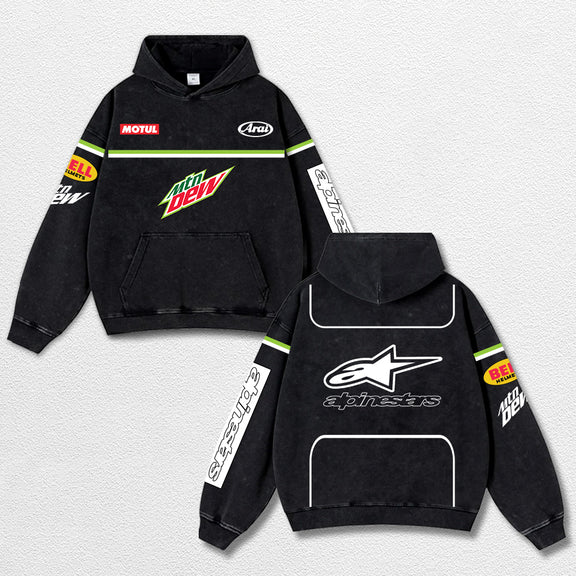 Retro Alpinestars Mountain Dew Racing Washed Hoodie MotoGP World Champion Enthusiast Apparel Streetwear Racing Team Super Motorsports Clothing Riders Motocross Off-Road Dirt Bike Fan Gear Cotton For Moto Fan