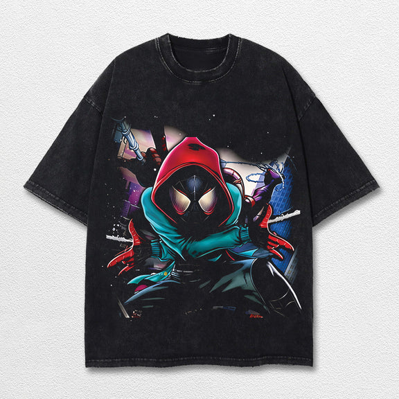 Miles Morales Spider-Verse Hero Comic Double Printed Oversize Lightweight Acid Washed Tee, Character Marrvel Comics TV Series Graphic Design Unisex Top Cotton Streetwear T-Shirt Clothes Menswear