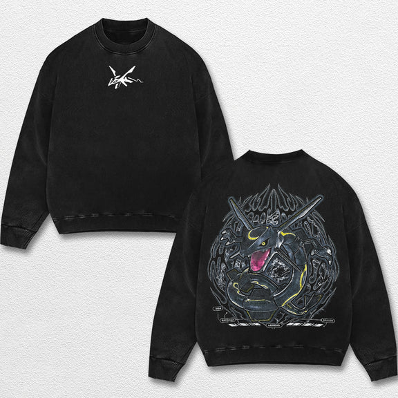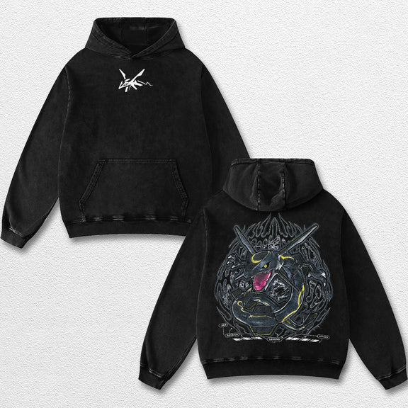 Retro Rayquaza - Pokemon Oversize Lightweight Acid Washed Hoodie Sweatshirt Tee, Anime Graphic Design Unisex Top Cotton Streetwear Shirt Clothes